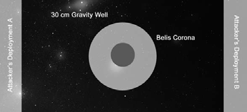 Set up a 180 cm × 120 cm table. Place the planet Belis Corona in the dead centre of the table. This planet’s gravity well extends 30 cm. Each player places an asteroid field anywhere on the table that is at least 30 cm from the planet.