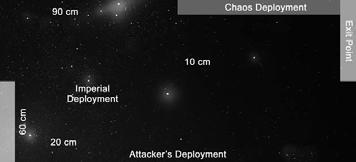 The Imperial player needs to move five transports off the table via the exit point (see the map) as well as move 25% of his fleet (points wise) off the same table edge. This 25% may not include crippled vessels. Both of these stipulations must be achieved to win.