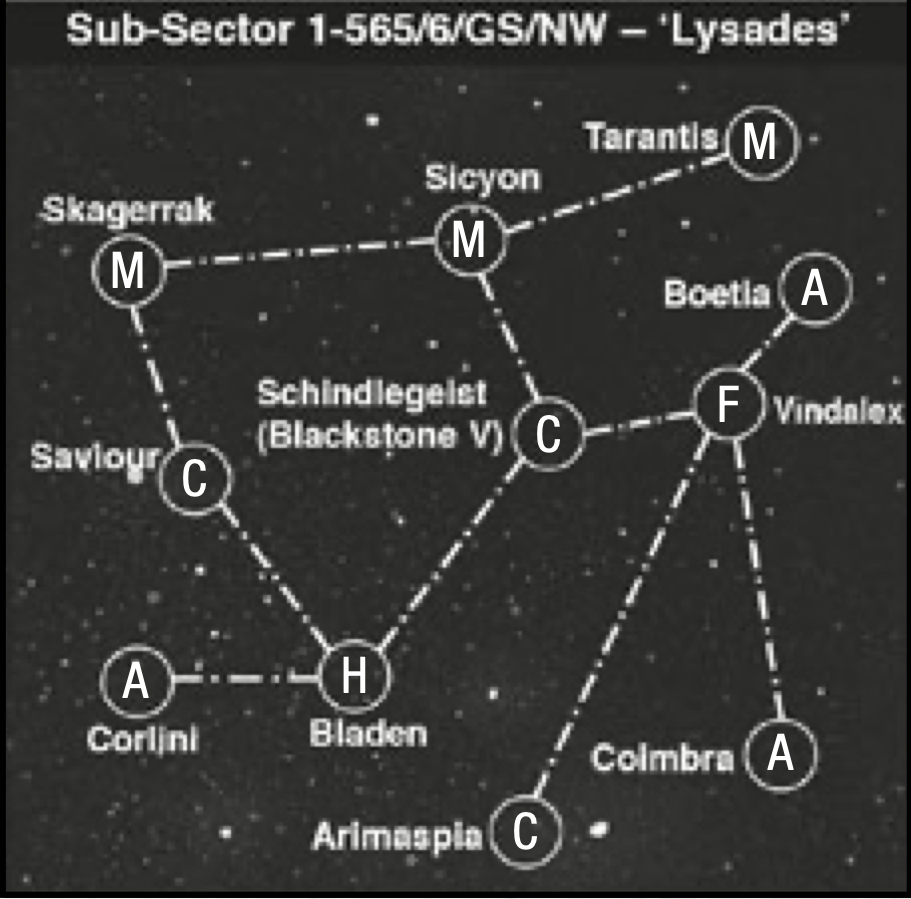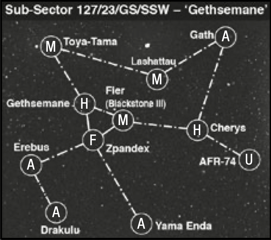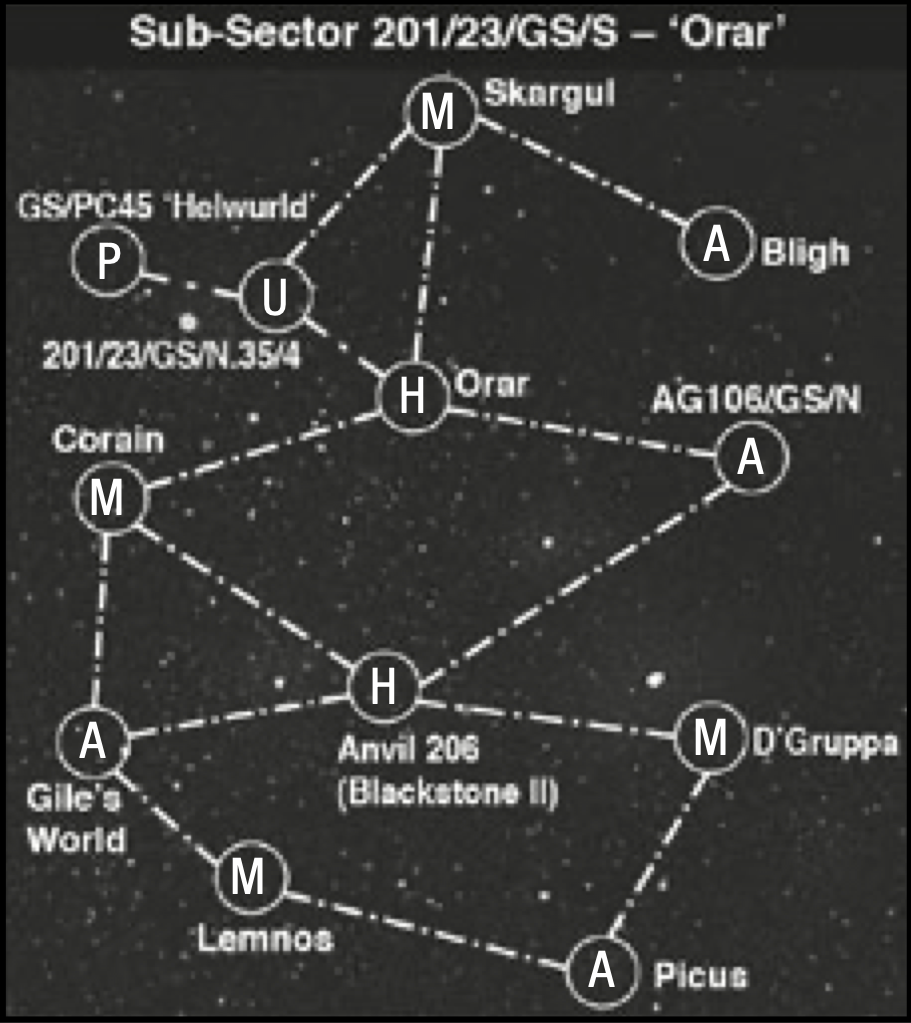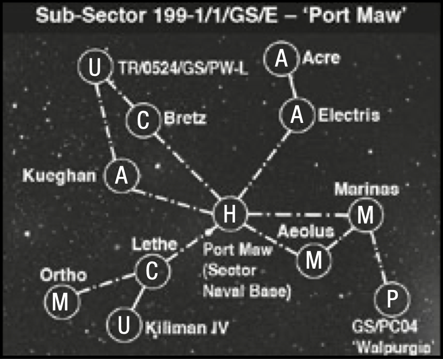 A sub-sector contains many stars, but of these only a few will have any planets orbiting. The vast majority will be gas giants or planets locked in sub-zero ice ages. This means that any given sub-sector will have relatively few star systems actually worth fighting over. Of these, the majority will be mining worlds, agri-worlds and other worlds with a sizeable population and contemporary technology level (categorised as civilised worlds). A few systems may have a forge world, hive world or other such planet. Occasionally uninhabited systems also have strategic importance as jump points or gathering places for assembling war fleets. The sub-sector maps only show those systems of military or strategic importance to the forces fighting in the Gothic War.